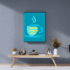 A modern, minimalist graphic of a steaming coffee cup in turquoise and black, framed with rounded edges. The playful quote inside the cupβ“Running on caffeine and dreams.”βis written in vibrant yellow, reflecting the hustle culture and creative spirit fueled by ambition and coffee. Ideal for mugs, digital wallpapers, or motivational cafΓ© posters.