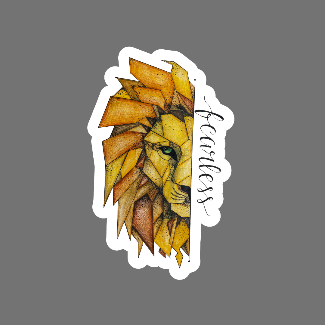 This striking artwork showcases a geometric lion’s face, composed of sharp angular shapes in shades of golden yellow, amber, and deep brown. Half of the lionβs face is depicted in intricate polygonal forms, while the other half is replaced by the bold calligraphy of the word “fearless”. The piercing green eye at the center draws immediate attention, symbolizing inner strength and courage. The image exudes a powerful message of bravery and resilience, making it an inspiring visual statement.