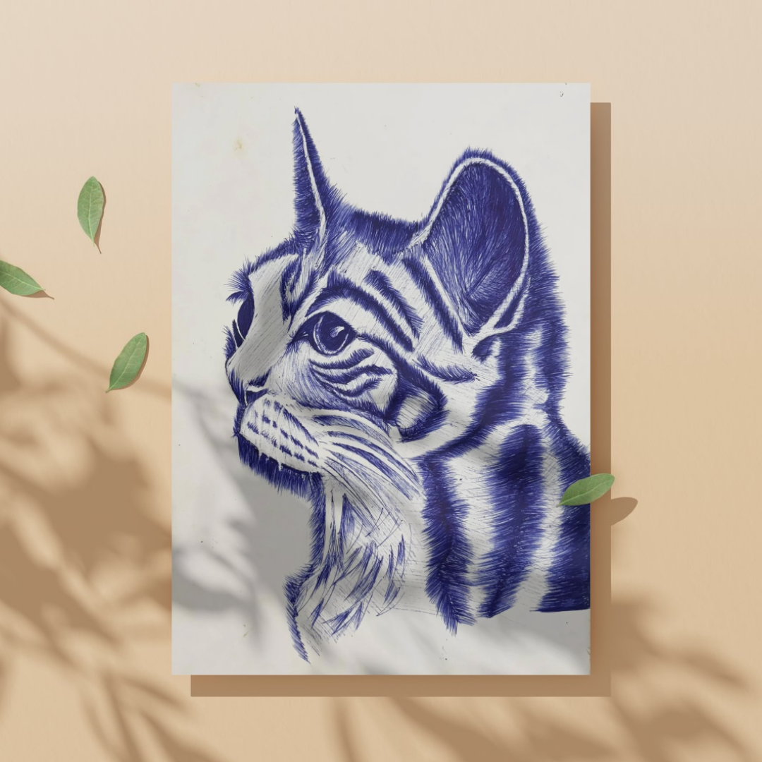 A stunning pen sketch of a cat’s side profile, drawn entirely in deep blue ink. The fine strokes and cross-hatching techniques capture the feline’s fur texture and focused expression. Its large, observant eyes radiate curiosity and calmness, showcasing the artistβs keen attention to natural detail and emotion.